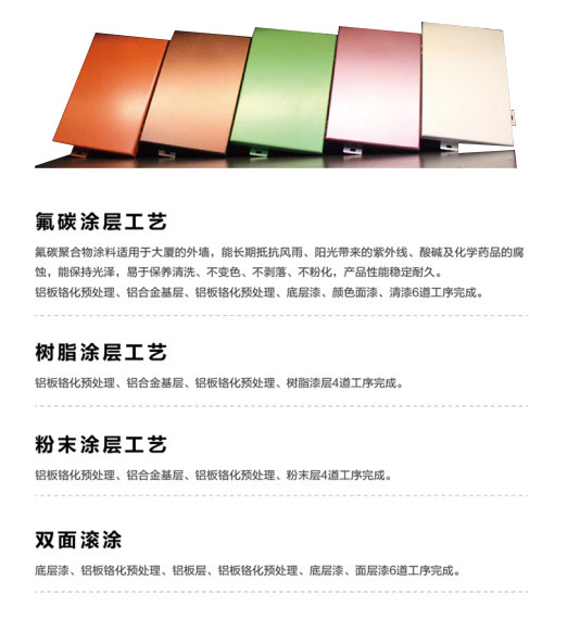 氟碳涂層具有抗腐蝕性和耐候性,耐冷性好,能抵御強(qiáng)烈的紫外線的照射,并長(zhǎng)期保持不褪色、不粉化、涂屏均勻,色彩豐富多樣,使用壽命長(zhǎng)。