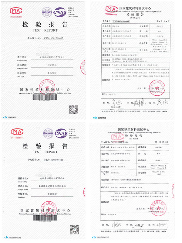 烤瓷鋁板的性能通過國家建筑材料質量監(jiān)督檢驗中心檢測,按國家標準GB/T23443-2009《建筑裝飾用鋁單板》的標淮得出的數(shù)據,所有的指標都是合格,特別其硬度達到6H以上。防火性能通過國家防火建筑材料質量監(jiān)督檢驗中心檢測,按國家標準BB/T8624-2006《建筑材料及制品燃燒性能分級》的標準得出數(shù)據,其防火性能A1級。