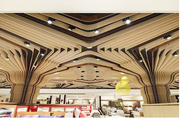 弧形鋁方通可根據(jù)現(xiàn)場定制不同彎度,造型獨(dú)特,可解決過道彎曲裝修問題,為業(yè)主提供更多的裝修方案。