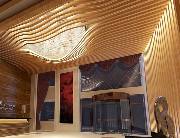 弧形鋁方通吊頂?shù)脑O(shè)計(jì),有基本的兩點(diǎn)要求,一個是底寬的要求,另一個是厚度的基本要求。兩者都是因?yàn)榧庸すに嚨南拗茝亩艿较拗?,波浪造型鋁方通吊頂?shù)牡讓?,一般建議在30mm以上,小30mm,因?yàn)椴ɡ嗽煨弯X方通吊頂,是通過電焊固定成型的,電焊的過程中,需要保證整個鋁方通的平直度,如果底寬太小,電焊加工的過程中很容易造成歪曲,從而影響整根鋁方通的效果,其次,厚度的基本要求,是因?yàn)椴ɡ嗽煨弯X方通吊頂燒焊加工而成,燒焊的焊點(diǎn)比較多,溫度較高,如果是太薄的板子,一燒焊就穿了,這樣自然是加工不了的,因而波浪造型鋁方通吊頂厚度要求在2.0mm以上